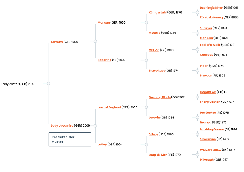 Die Mutter der Stute ist LADY JACAMIRA, die mit der Hamburger Meile Gr. 3 gewonnen hat und weiterhin 3 mal platziert war (inkl. Gr. 3). Mitterlweile ist sie Mutter von 5 Siegern. Am erfolgreichsten war dabei LADYKILLER mit einem GAG von 93,5 kg.